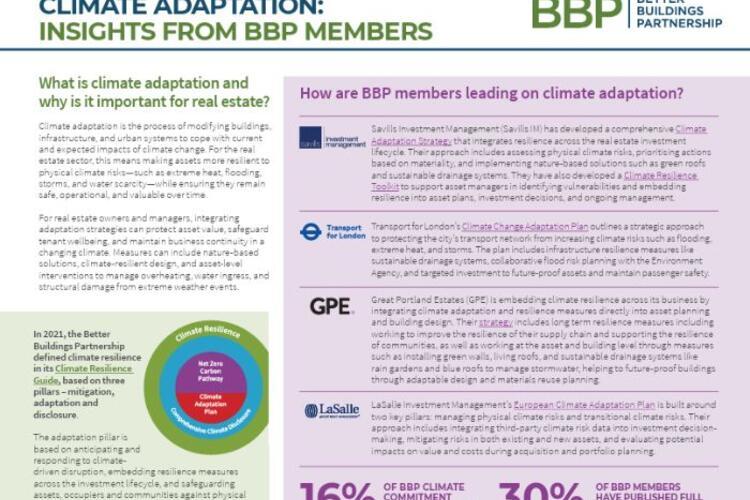 The Better Buildings Partnership has published another one-pager outlining the importance of climate adaptation for real estate, showing how resilience measures can protect long-term asset value, safeguard occupiers, and maintain business continuity in the face of climate risks such as flooding, heat, and storms.